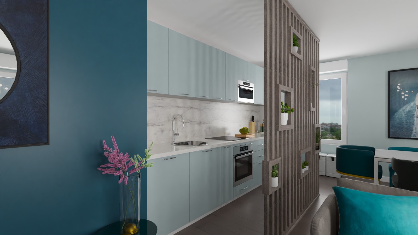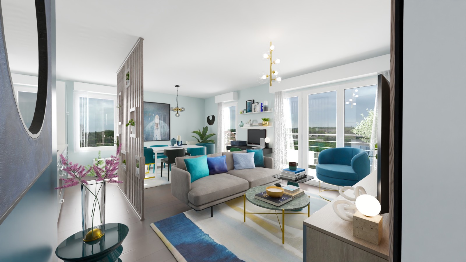 Design intérieur moderne et élégant d'un appartement neuf T3 avec une cuisine américaine à Saint-Germain-en-Laye (78100)