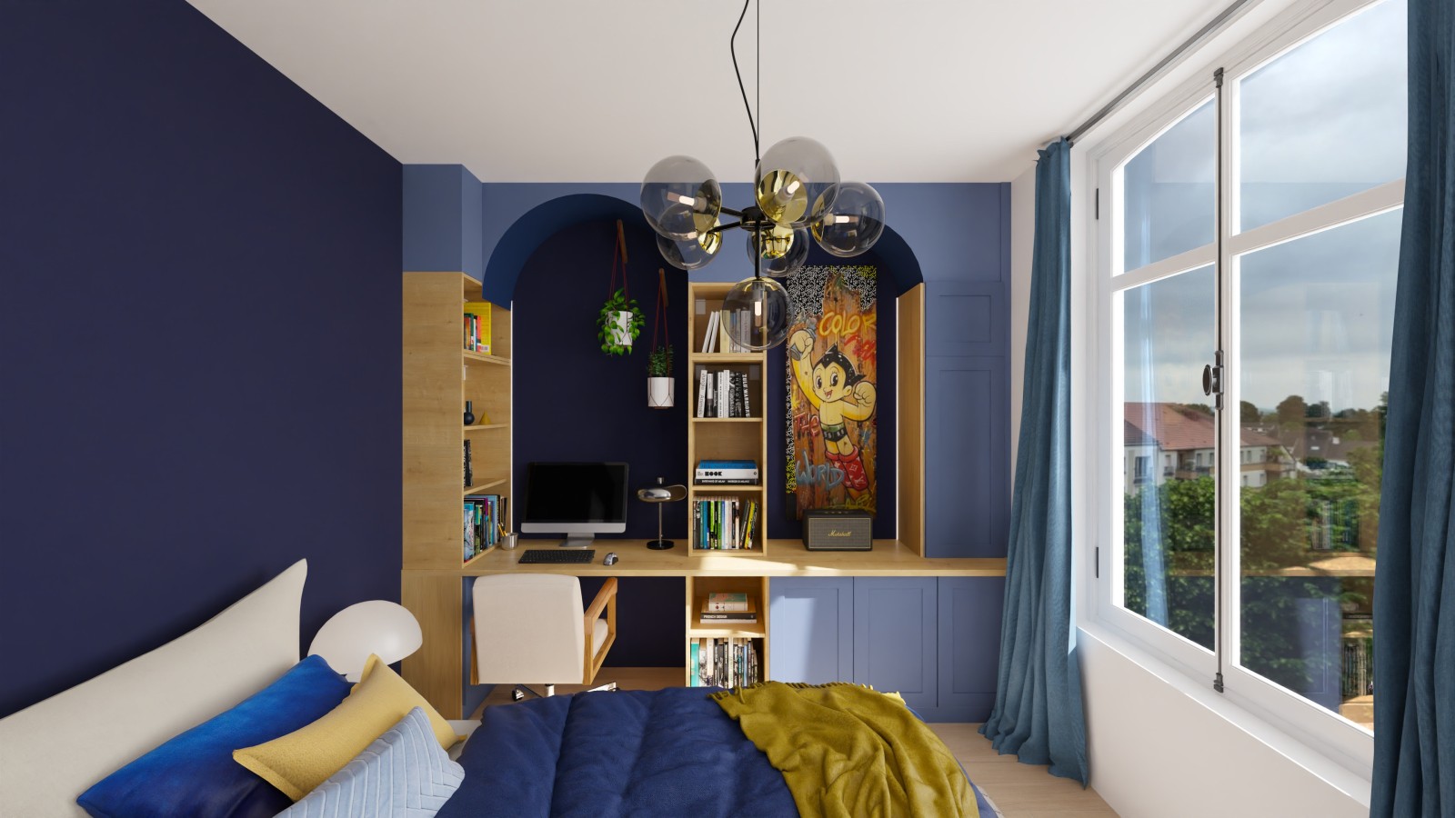 Les espaces nuit sont également optimisés : création d’un coin bureau intégré pour une chambre d’adolescent, avec niches arquées et éclairages indirects, et conception d’une chambre parentale sobre et enveloppante. Chaque étape de cet aménagement intérieur de duplex à Paris 16 permet d’anticiper les contraintes techniques tout en garantissant une cohérence esthétique globale.