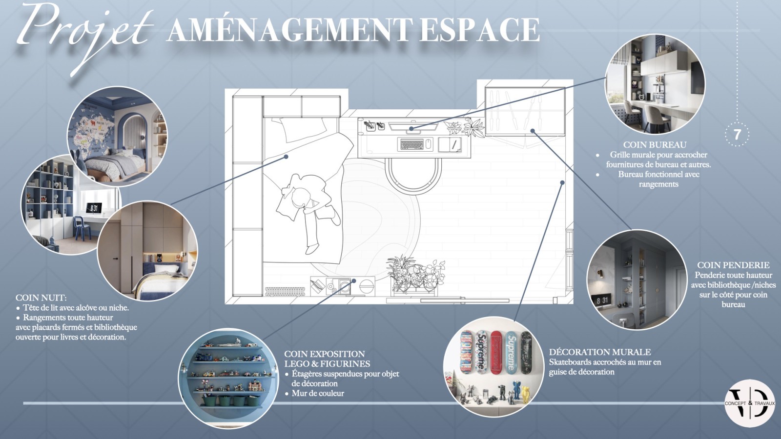 Chaque enfant est différent, chaque ado a son propre univers, et c’est à partir de cette réalité que nous avons pensé plusieurs scénarios d’aménagement. L’idée ? Offrir à nos clients plusieurs options, à la fois esthétiques, fonctionnelles et adaptées à l’âge et à la personnalité de chacun: Clément 8 ans et Louis 11 ans.
