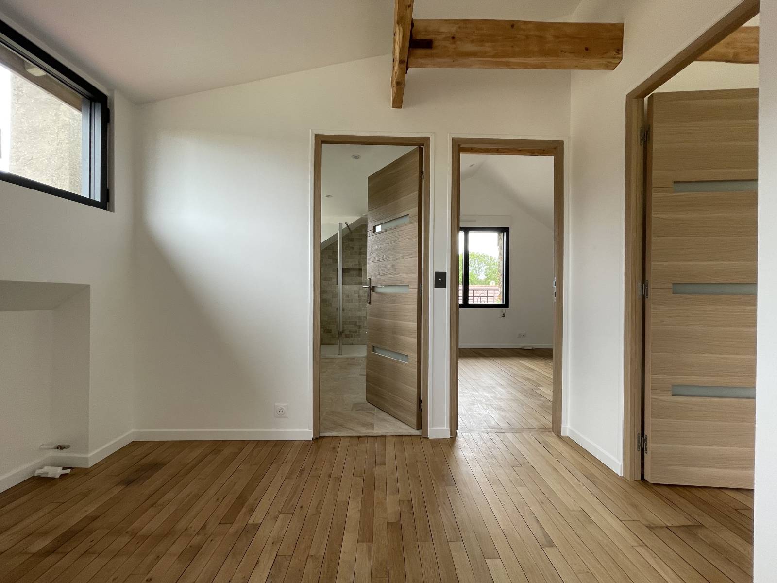 Un ré-agencement total du rez-de-chaussée a été effectué, incluant la création d'une salle de douche et d'un WC dans un ancien bureau.